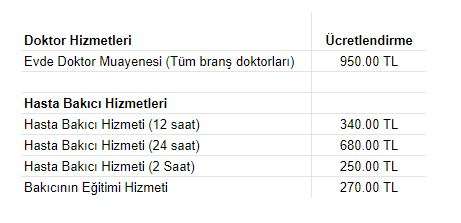 - Yılbaşı, resmi ve dini bayram tatillerinde özel evde bakım hizmetleri ücretleri, liste fiyatlarının (malzeme, cihaz ve laboratuvar hizmetleri hariç) %50 fazlası olarak hesaplanacağını kabul etmiş olursunuz.
